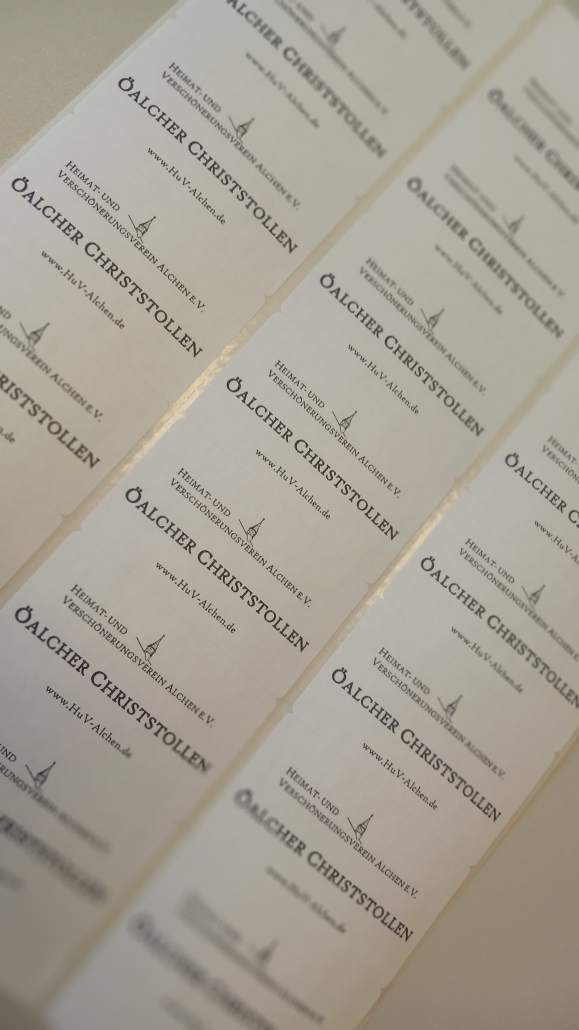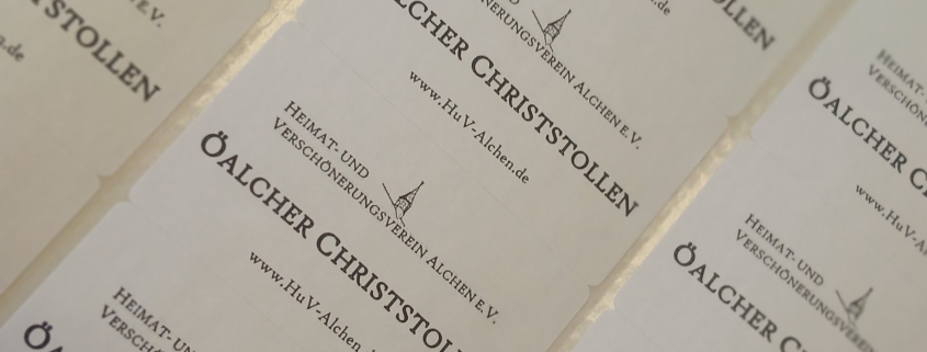Heute Morgen wurden die neu gestalteten Etiketten für die Öalcher Christstollen geliefert, die am 15. November in verschiedenen Größen im Schanzenofen des Backes des Heimatvereins zubereitet werden und die noch bis zum kommenden Montag (3. November) bei Alfons Täufer täglich zwischen 17.00 und 19.00 Uhr telefonisch unter 0271 / 3757351 oder jederzeit per E-Mail (alfons.taeufer@t-online.de) vorbestellt werden können.