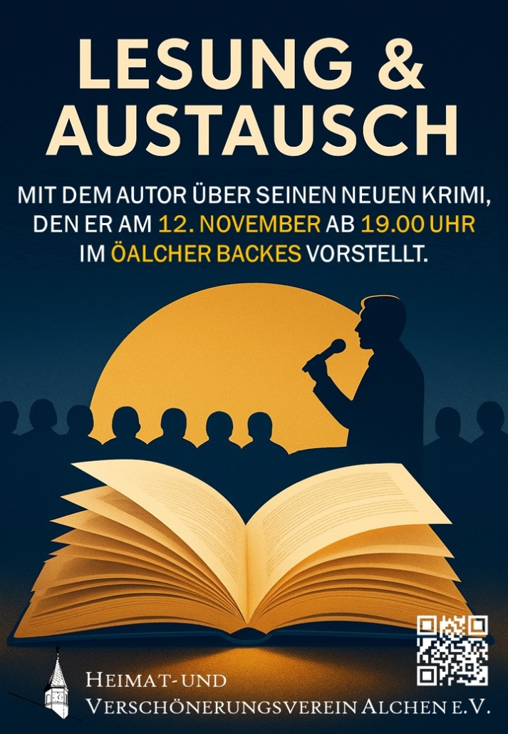 Am 12. November findet im Öalcher Backes eine Lesung statt, bei der relevante Stellen aus dem neusten Krimi vorgelesen werden und bei der der Autor im Anschluss für eine Fragerunde und zum Signieren seines Werks zur Verfügung steht. Das literarische Event wird umrandet durch passende Snacks und Getränke, die sich am Inhalt des Buchs orientieren.