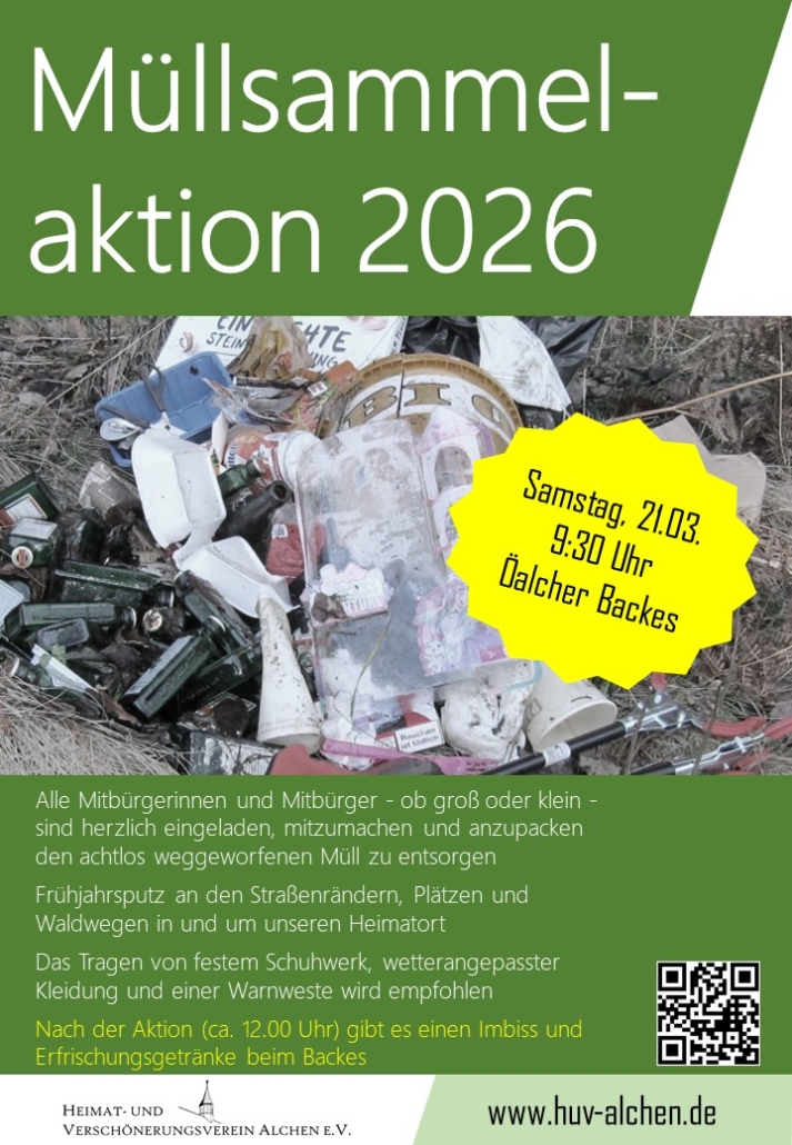 Auch in diesem Jahr möchten wir am Samstag, 21. März, ab 9.30 Uhr (Treffpunkt Öalcher Backes) gemeinsam unseren Heimatort von achtlos weggeworfenem Müll befreien und ihn wieder ein Stück schöner machen. Deshalb laden wir alle Mitbürgerinnen und Mitbürger – ob groß oder klein – herzlich ein, beim Frühjahrsputz tatkräftig mit anzupacken. Zusammen wollen wir die Straßenränder, Plätze und Waldwege in und um Alchen von Unrat säubern und damit einen wichtigen Beitrag zum Umwelt- und Naturschutz leisten. Jede helfende Hand zählt! Besonders freuen wir uns, wenn auch Kinder und Jugendliche mit dabei sind – denn Umweltbewusstsein beginnt schon im Kleinen. Das Tragen von festem Schuhwerk, wetterangepasster Kleidung und einer Warnweste wird aus Sicherheitsgründen empfohlen.